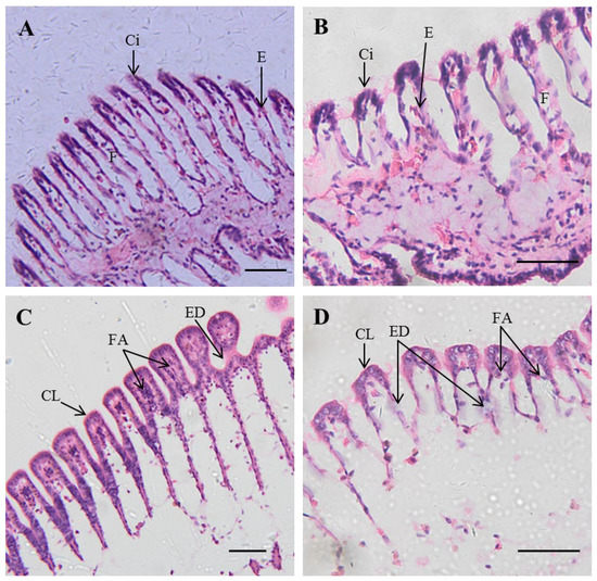 Light micrographs of transverse and longitudinal gill sections of Anodonta woodiana revealed the histological structure of the control (A,B) and Cu-treated (C,D) groups. Ci: cilia, E: epithelium, F: filament, CL: cilia loss, ED: epithelium desquamation, FA: filament atrophy. Scale bar: 50 μm.