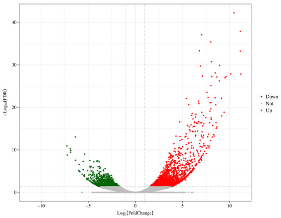 Bowtie and RNA-seq by expectation maximization (RSEM) were used to estimate the expression levels of all transcripts and to determine mRNA expression levels by calculating fragments per kilobase per million (FPKM). Differentially expressed genes (DEGs) were identified with log2 | fold-change | > 1 and FDR < 0.05 using the R package DESeq2 [38]. The GO database (http://geneontology.org) was used to reveal the biological functions of the DEGs. The KEGG database (http://www.genome.jp/kegg, accessed on 7 October 2021) was used to analyze the signaling pathways mainly involved in the DEGs based on the hypergeometric model. GO enrichment analysis of the DEGs was conducted using GOseq software. KOBAS software was used to identify the statistical enrichment of DEGs in the KEGG pathway analysis.