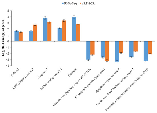 A total of 3160 genes were differentially expressed in the gills of the Cu-treated group compared to in those of the control group, including 1870 upregulated and 1290 downregulated genes (Figure 3). To confirm the veracity and reliability of the DEGs identified by RNA-seq, 10 genes were selected for qRT-PCR analysis. As shown in Figure 4, the qRT-PCR expression patterns of these genes were in agreement with the results of the RNA-seq analysis (R2 = 0.958, p < 0.05).