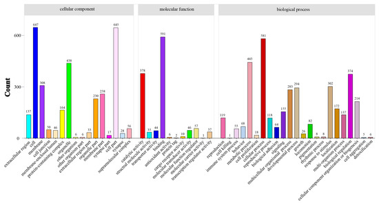 To obtain insight into the biological functions that can be differentially regulated by Cu exposure, GO enrichment analysis was performed, comparing the Cu and control groups. The GO enrichment analysis included three major functional categories: biological processes, cellular components, and molecular functions. Cellular processes, metabolic processes, biological regulation, and responses to stimuli contained the most DEGs in biological processes (Figure 5). The cell, cell part, organelle, and membrane contained the most DEGs among the cellular components (Figure 5). Binding and catalytic activity contained the most DEGs in terms of molecular functions (Figure 5).