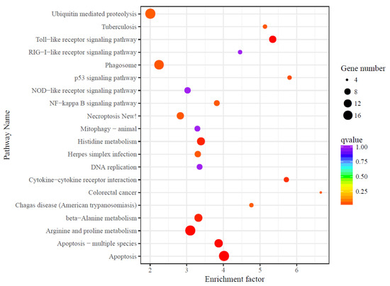 Kyoto Encyclopedia of Genes and Genomes (KEGG) enrichment of differentially expressed genes (DEGs) after 2.0 mg/L Cu exposure for 72 h. The vertical axis represents different pathways, and the horizontal axis represents the richness factor. Color shades correspond to different q-values, and dot size represents the number of DEGs.