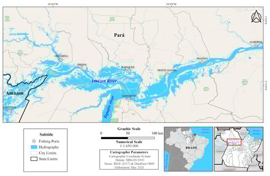 The fishery data analyzed in the present study were collected along a stretch of approximately 480 km (in a straight line) of the Lower Amazon River, including the principal course of the river, its lateral channels, creeks, and marginal and floodplain lakes, between the municipality of Parintins in the Brazilian state of Amazonas and Almeirim in the state of Pará (Figure 1). In this region, the river is extremely wide, and its margins are lined with extensive, shallow floodplain lakes and other seasonally flooded areas—some of which are forested, while others have more open vegetation. Over the course of the year, the level of the river rises and falls by approximately seven meters, leading to the flooding of land margins during the periods of peak rainfall and river discharge []. These fluvial environments and floodplain areas are exploited extensively by artisanal fishing vessels, which land their catches in the ports of the municipalities of Parintins, Oriximiná, Óbidos, Alenquer, Santarém, Monte Alegre, Prainha, and Almeirim [].