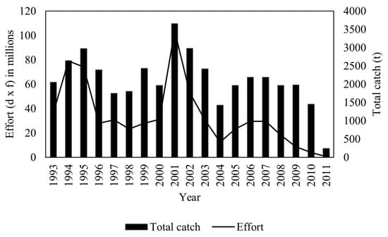 Catches and fishing effort presented similar patterns of variation over time (Figure 2). The total catch was highest in 2001, followed by 1995 and 2002, while fishing effort peaked in 1994 and 2001 (note that data were only collected in the first half of 2011).