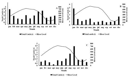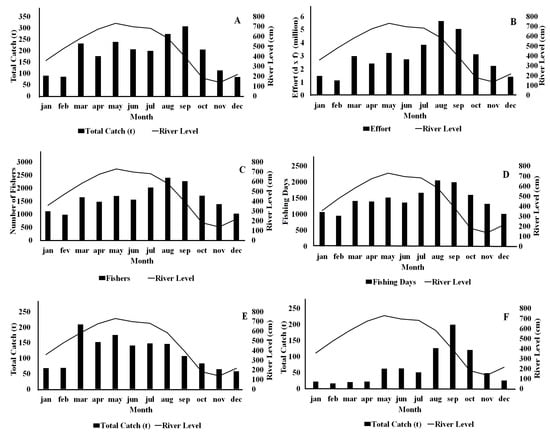 The catch varied seasonally and was associated with the hydrological cycle (Figure 3A). The largest catches were recorded in August and September, which corresponds to the ebb period, when the river level was falling. The fishing effort, number of fishers, and the number of fishing days all decreased as the level of the river increased between January and July (Figure 3B–D).