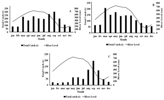 Fishery production from the rivers varied most in seasonal terms, for both lines and gillnets, with peaks during the ebb water period—that is, in August and September (Figure 4C and Figure 5C). Considering the type of gear and environment specifically, the gillnet catches in the lakes were the most homogeneous over the course of the year, but peaked during the high-water months, i.e., March through May (Figure 5B), whereas line fishing in the lakes was most productive in December and January, that is, during the flooding phase (Figure 4B).
