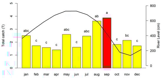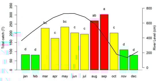 Amazonian fisheries are complex and highly dynamic, and depend on the availability of specific environments, which is in constant flux due to the seasonal oscillations in river levels [,]. The fishers’ knowledge of the patterns of fluctuation in both the environment and the fish fauna [] is also fundamental to the optimization of fishing strategies. This dynamic was confirmed in the present study, which demonstrated a clear association between catch sizes and the hydrological cycle (Figure 3). The months of the low water phase are known as the harvest season—that is, the most productive period when fisheries increase in efficiency as the dimensions of the aquatic environment shrink [,,].