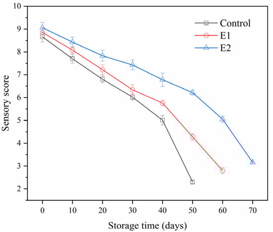 The sensory score was chosen to evaluate the shrimp muscle quality, as this parameter changes significantly during chilled storage. Figure 1 shows the sensory score results. The initial values of 8.66, 8.85, and 9.06 for the control, E1, and E2 groups, respectively, indicated that the sensory quality of shrimp in the three groups showed high acceptability. In addition, the shrimp samples of the E2 group had the highest initial values of the sensory scores, indicating that citric acid, trehalose, and VC soaking treatment improved the acceptability of the shrimp samples during chilled storage. With increasing storage time, the sensory ratings of all three groups declined considerably (p < 0.05), with the control group having the lowest values. The shrimp samples in the three groups exhibited a slight off flavor towards the end of chilled storage, and the liquid was cloudy and yellow. A severely broken shrimp muscle was also observed in the control group. The control, E1, and E2 samples were regarded as unacceptable on day 50 (2.3), day 60 (2.8), and day 70 (3.16), respectively. The shelf life of the sample was increased by approximately 20 days by the E2 treatment compared to the control group. A possible reason for this is that the addition of citric acid and VC decrease pH, resulting in less bacterial growth []. In addition, citric acid is a natural metal ion chelator that indirectly inhibits the oxidation of proteins [].
