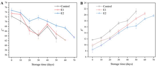 L* value (A) and b* value (B) of the control shrimp, shrimp preserved in 4% NaCl (E1) solution, and shrimp preserved in 4% NaCl, 0.34% citric acid, 4.23% trehalose, and 0.04% VC solution (E2) during chilled storage.
