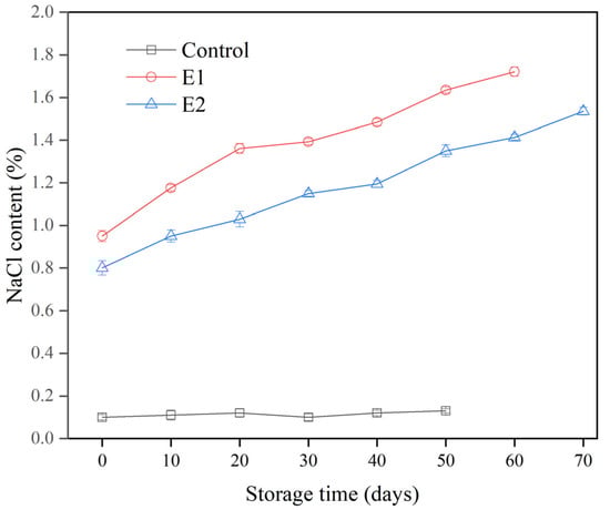 Excessive intake of NaCl is linked to an increase in the risk of cardiovascular diseases and hypertension []. According to the World Health Organization and the Chinese Dietary Guidelines, the daily intake of NaCl in adults should not exceed 5 or 6 g []. As shown in Figure 3, there were no significant changes (p > 0.05) in the NaCl content in the control shrimp muscle with the extension of refrigeration time. By contrast, the NaCl content in the E1 and E2 shrimp samples both showed an increasing trend. This was mainly because the NaCl in the solution gradually penetrated the shrimp muscle tissues under the effect of osmotic pressure [,]. The gradual destruction of tissue integrity and structure during refrigeration also caused an increase in the NaCl content in shrimp muscle []. During the same refrigeration time, the NaCl content in the shrimp muscle of the experimental group (E2) was considerably lower than that of the E1 group (p < 0.05). This is likely because the trehalose in the E2 group acted as a protective agent, forming a physical protective film on the surface of shrimp muscle, which maintained the stability of the muscle tissues. In addition, the preferential binding of trehalose to water molecules after penetrating shrimp muscle tissues resulted in a smaller radius of the protein solubilization layer, reduced mobility, a tighter molecular structure, and a more stable spatial conformation. These changes also prevented NaCl from entering the shrimp muscle tissues. Thus, the E2 soaking solution had positive effects on reducing the NaCl content in shrimp muscle and ensuring consumer safety, and these results are in line with the development of low-salt food products.