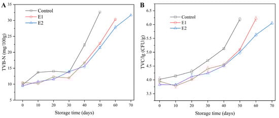 Figure 4A shows the TVB-N changes in the three sample groups during chilled storage. Chinese hygienic regulations state that the acceptable TVB-N content in shrimp should be less than 30 mg/100 g. The initial TVB-N contents in the control, E1, and E2 groups were 9.8, 10.5, and 9.5 mg/100 g, respectively. As the chilled storage time was prolonged, each group demonstrated a gradual increase at varying rates. However, the control group showed a sharp increase at day 30, which was significantly higher than the other two groups (p < 0.05). The TVB-N content of the shrimp samples in the control group reached 32.62 mg/100 g on day 50, whereas the content in the shrimp samples of the E1 and E2 groups reached 30.36 and 31.62 mg/100 g on days 60 and 70, respectively. TVB-N accumulation in aquatic products is the result of protein degradation caused by microbial activity []. Thus, the results demonstrate that the E1 and E2 treatments significantly maintained the freshness of the shrimp samples. Furthermore, at the 30th day of chilled storage, the E2 samples exhibited relatively higher TVB-N content compared with the E1 samples. This might be attributed to the effects of citric acid and VC on the muscle connective tissues during the initial storage, which slightly induced the degradation of proteins into alkaline nitrogen-containing substances. In a previous study conducted by Mol et al. [], the TVB-N values of crayfish soaked in citric acid exhibited a similar trend of change during the pre-existing period as observed in the current study. With the extension of storage time, the E2 treatment maintained better antimicrobial activities, resulting in lower TVB-N content in the E2 samples compared with the E1 group.