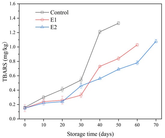 Figure 5 shows the TBARS value in shrimp from the control, E1, and E2 groups during chilled storage. The TBARS value serves as a metric for the malondialdehyde content, which is one of the secondary products formed via the decomposition of unstable hydroperoxides during oxidation process of polyunsaturated fatty acid []. The fresh shrimp samples showed low TBARS values, indicating high quality. During the storage period, the TBARS value increased exponentially. This may have occurred due to a rise in free fatty acids caused by bacterial lipase and phospholipase. Free fatty acids are extremely prone to oxidation, leading to the creation of unstable lipid hydroperoxides. On day 50, the TBARS value of the control shrimp samples was significantly greater than that in the E1 and E2 groups, indicating the shrimp samples of the E1 and E2 groups maintained the stability of muscle lipids. In addition, after 40 days of chilled storage, the TBARS value of the E2 group was substantially lower than that of the E1 group, and this phenomenon may be attributed to the antioxidant effects of VC and citric acid [,]. Similarly, at the 30th day of chilled storage, the TBARS values of both E2 and E1 samples exhibited a similar trend to the TVB-N content, indicating that the weakened mechanical strength of connective tissues might accelerated the oxidation of fatty acids in the shrimp samples during the initial storage period [].