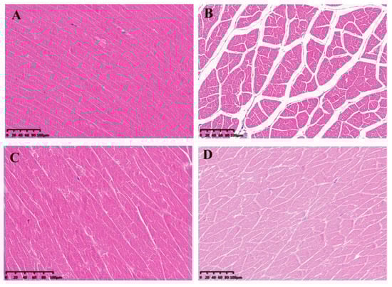 H&E staining image of ready-to-eat shrimp (second abdominal segment, longitudinal section). (A) Fresh ready-to-eat shrimp (0 d); (B) shrimp preserved in distilled water (control; 40 d); (C) shrimp preserved in 4% NaCl solution (E1; 40 d); (D) shrimp preserved in 4% NaCl, 0.34% citric acid, 4.23% trehalose, and 0.04% VC solution (E2; 40 d).