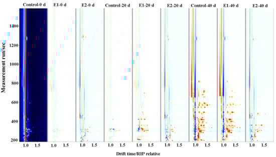Fingerprint comparison of the VOCs of shrimp samples during chilled storage. Control, shrimp preserved in distilled water (0, 20, and 40 d); E1, shrimp preserved in 4% NaCl (E1) solution (0, 20, and 40 d); E2, shrimp preserved in 4% NaCl, 0.34% citric acid, 4.23% trehalose, and 0.04% VC solution (0, 20, and 40 d).