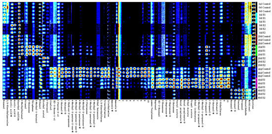 In order to enhance the comprehension of the variations in VOCs among the nine samples, a total of 59 significantly different VOCs were used for PCA (Figure 9). With a 65% contribution from PC1 and a 13% contribution from PC2; PC1 and PC2 principal components had a cumulative contribution of 78%, indicating that the similarity between different samples can be explained []. From the PCA analysis (Figure 9), VOCs in the E2 group on days 0 and 20 were comparable to those in the E2 group on day 40. In addition, VOCs of the control group on days 0 and 20 were similar to those of the E2 group on day 40. A substantial separation was observed between the control and E1 groups on day 40, and the E1 group on day 20. This indicated different relative contents of individual volatile compounds in all three groups at these time points. Compared with the control and E1 groups, a smaller change in volatile flavor substances occurred in E2 during chilled storage.
