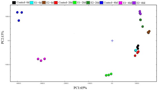 PCA plot based on the signal intensity obtained from the control, shrimp preserved in 4% NaCl solution (E1), and shrimp preserved in 4% NaCl, 0.34% citric acid, 4.23% trehalose, and 0.04% VC solution (E2) during 40 days of chilled storage.