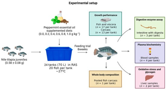 The remaining fish were fasted for 24 h, euthanized in clove oil immersion (400 mg L−1), and weighed to calculate the body weight gain, relative feed intake, feed conversion rate, and protein efficiency rate (n = 68 per treatment). Blood samples from four fish per tank (n = 16 per treatment) were collected in the caudal vein using a heparinized syringe to determine plasmatic levels of glucose, cholesterol, triacylglycerol, high-density lipoprotein (HDL), and low-density lipoprotein (LDL). Subsequently, the liver and viscera of the fish were removed and separately weighed to calculate the viscerosomatic and hepatosomatic indexes, respectively. Furthermore, liver samples from two fish per tank (n = 8 per treatment) were collected to evaluate oxidative stress biomarkers and glycogen content. Samples for oxidative stress were preserved at −80 °C until analysis. Samples for glycogen determination were immediately placed in test tubes with potassium hydroxide solution (30% KOH). The remaining carcasses of thirteen fish per tank were separated to calculate the carcass yield (n = 52 per treatment) and polled (n = 1 per treatment) to determine the bodies’ chemical compositions. Figure 1 shows the experimental setup of the experiment.