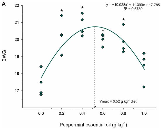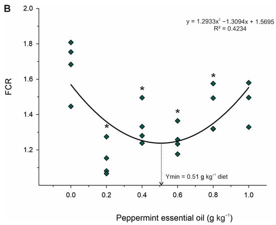 Fitted orthogonal polynomial contrast for quadratic plots of body weight gain (BWG; (A)) and feed conversion ratio (FCR; (B)) as a function of the level of peppermint essential oil in diets for juvenile Nile tilapia. Each dot point represents the mean of each replicate, and superscripts (*) indicate significant differences from the control diet (peppermint essential oil = 0 g kg−1) by Dunnett’s test (p ≤ 0.05).