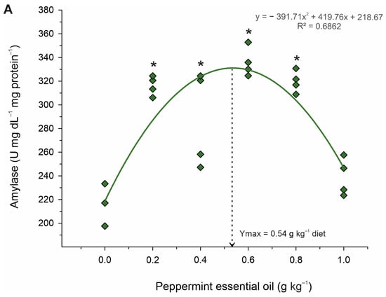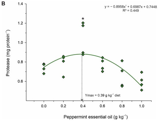 Fitted orthogonal polynomial contrast for quadratic plots of enzymatic activity of amylase (A) and protease (B) in the gut as a function of the level of peppermint essential oil in diets of juvenile Nile tilapia. Each dot point represents the mean of each replicate, and superscripts (*) indicate significant differences from the control diet (peppermint essential oil = 0 g kg−1) by Dunnett’s test (p ≤ 0.05).