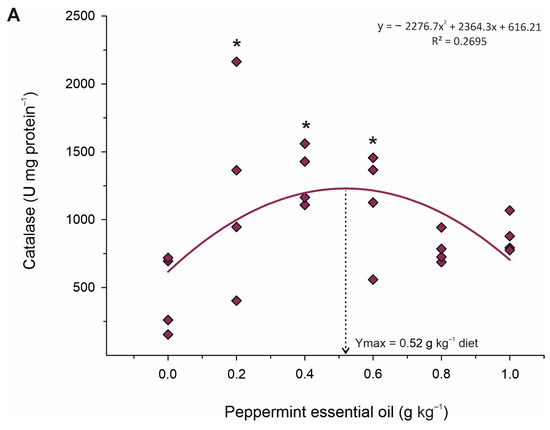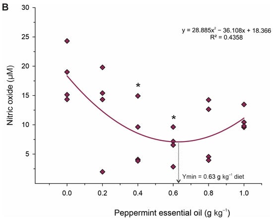 Fitted orthogonal polynomial contrast for quadratic plots of activity of catalase (A) and nitric oxide content (B) in the liver as a function of the level of peppermint essential oil in diets of juvenile Nile tilapia. Each dot point represents the mean of each replicate, and superscripts (*) indicate significant differences from the control diet (peppermint essential oil = 0 g kg−1 diet) by Dunnett’s test (p ≤ 0.05).