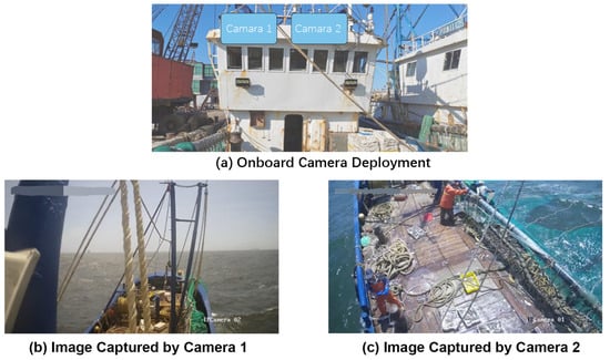 This project placed onboard cameras on two trawlers to expand the diversity of the image dataset of fishing vessel operations. Directly on the deck, two gun-mounted cameras were placed, with camera 1 inclined upward to record the activities at the bow and camera 2 angled downward to record the activities at the deck. The collection of images of fishing vessel operations is shown in Figure 1.
