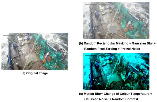 This study specifically incorporates some complex environmental factors that may be encountered in the process of simulating fishing boats at sea, such as changes in light and obstruction of vision, in the construction of the dataset to identify the operational status of fishing boats more accurately. Enhancing the dataset can significantly increase the model’s resilience and accuracy because these complicated aspects frequently create increased interference with the identification of fishing vessel operating status in actual applications. A total of 2319 data photos were obtained after the dataset was expanded using a combination of Gaussian noise, random rectangular occlusion, random pixel zeroing, pretzel noise, Gaussian blur, motion blur, changing color temperature, and random contrast. Of these, 1857 images were used for the training set, 345 images were used for the test set, and 117 images were used for the validation set. The data enhancement samples are shown in Figure 2.