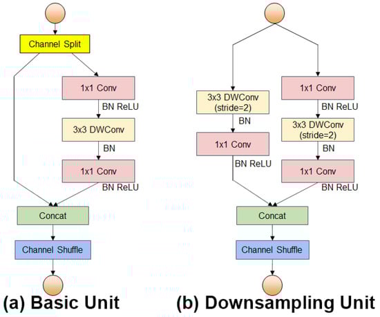 The sizes of fishing nets and deck crew in the collected fishing vessel operation images in this study belong to large and medium targets in the image. The backbone network CSP-DarkNet53 of YOLOv5s has a deeper network depth and larger model capacity, which provides higher performance in terms of accuracy, but its number of parameters and computational complexity are also larger. To meet the requirements of high accuracy, real-time operation on low computing power devices, and fewer model parameters, the YOLOv5s backbone feature extraction network is replaced by the ShuffleNetV2 network. ShuffleNetV2 introduces the concept of “channel split” based on ShuffleNetV1 [], and redesigns the basic structure module into two types: the basic unit and the downsampling unit, as shown in Figure 3.
