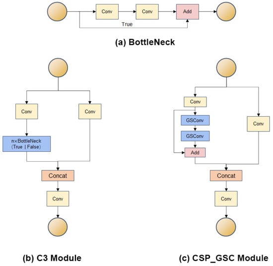 The C3 module and the CSP_GSC module are shown in Figure 5. The C3 module of YOLOv5s consists of a bottleneck and contains a large number of parameters, which makes it computationally intensive. In order to reduce the number of parameters of the neck network and improve the detection speed of the model. The study replaces the normal convolution and C3 modules in the YOLOv5s feature fusion network with the GSConv and CSP_GSC modules to reduce the size of the model. The CSP_GSC module is a replacement of the Conv module of BottleNeck in the C3 module with the GSConv module, so the parameters and computational effort in the CSP_GSC module are reduced. Note that since the Ghost module has two normal convolutions and two depth-wise convolutions in its bottleneck structure, if used extensively and without special optimization, the speed in hardware will be reduced, offsetting the advantages of reducing the number of parameters and FLOPs. As the computing power of the platform grows, the advantages of GSConv become less obvious.GSConv is better suited for edge computing devices due to its smaller computing consumption and memory footprint. By changing the original operation of generating feature maps using convolutional kernels to retaining only a small number of convolutional kernels and replacing the rest of the convolutional operations with linear operations, the amount of computation and time required to generate feature maps can be significantly reduced [].