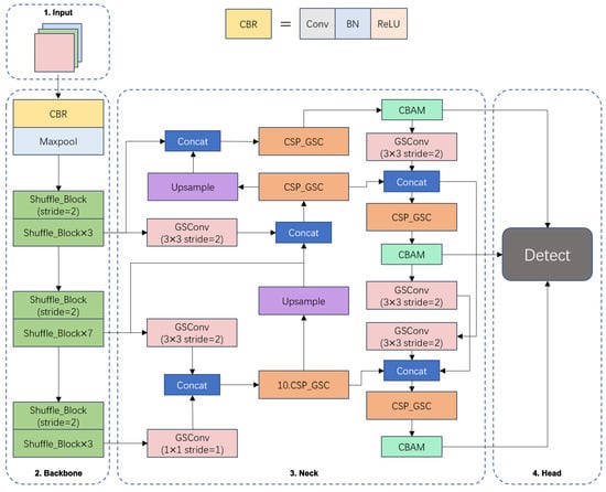 After the backbone feature extraction network is replaced with ShuffleNetV2, the feature fusion network is modified to a Generalized-FPN incorporating GSConv and CSP_GSC modules, and the CBAM attention module is added in front of the detection head, the structure of the lightweight real-time detection algorithm YOLOv5s-SGC based on the modified YOLOv5s network for fishing vessel personnel and retrieval nets is shown in Figure 7.