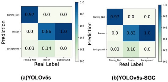 Figure 9 shows the confusion matrix for the YOLOv5s model and the YOLOv5s-SGC model. The horizontal and vertical coordinates indicate the FP and FN of the model, respectively, and the values on the diagonal line are the recall of the model’s predicted targets. From the figure, it can be seen that YOLOv5s has 86% and 97% detection rates for crew and nets, and 14% of crew and 3% of nets are mistakenly detected as background. In contrast, the detection rates of YOLOv5s-SGC for crew and nets were 82% and 97%, with 18% of the crew and 3% of the nets being falsely detected as background. Overall, the difference in classification performance between YOLOv5s-SGC and YOLOv5s is not significant, but YOLOv5s-SGC has reduced the model size by 86.64% and improved the computing speed by 57.97%, which can be better applied to the real ship operation status detection tasks of deck crew and fishing nets usage.