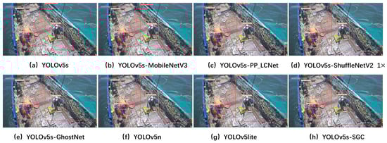 The detection results of each model on some of the test images are shown in Figure 10. These models were all able to identify the crew in the images and fishing net locations, but YOLOv5s-PP_LCNet appeared to misidentify them. The minimal number of parameters and computational effort of YOLOv5s-SGC also caused the model to have a low confidence level for some of the detected targets, but the confidence level was still above 0.5.