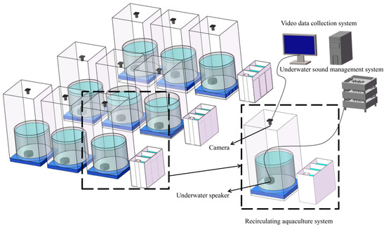 The experiment was conducted at the experimental base of Zhejiang University, Jianfeng Agricultural Development Co., Ltd. (Hangzhou, China). The experimental system encompassed a RAS, an underwater sound management system, and a video data acquisition system (Figure 1). The RAS provided a stable and reliable environment for the fish, while the underwater sound management system supplied the soundscape for the experimental conditions within the aquaculture tank. The video data acquisition system recorded the activity data of the fish throughout the experiment. The RAS consisted of a biological filter unit and an aquaculture pond. The aquaculture pond was a circular PVC structure with a height of 0.8 m and an interior diameter of 1 m. The biological filter unit consisted of a PVC water tank (1 m × 0.5 m × 0.8 m). It also had germicidal UV lights, aeration, oxygenation, and nitrification biofilms to remove NH4+-N and NO2−-N. The water circulation in the aquaculture ponds and biofilter units was driven by a whisper-quiet water pump, with water flow regulated by a flow control valve. The underwater sound management system consisted of a sound playback device and a sound analysis unit. Three players, three US-2150 power amplifiers, and nine US-0150 underwater speakers (80–2000 Hz) positioned at the base of the aquaculture tank constituted the sound playback unit (LingYan Electronic Technology Co., Ltd., Shanghai, China). The sound analysis equipment comprised an 8103 hydrophone, an AVANT MI-7008 data acquisition analyzer, and an AVANT MI-2004 power amplifier (Brüel & Kjaer Co., Ltd., Nærum, Denmark). The video data acquisition system included video cameras, LED lights, hard disk recorders, displays, and POE switches. For the purpose of recording the behavioral information of the experimental fish, cameras were installed on a stainless steel frame above the aquaculture pond. Noise reduction measures were implemented to mitigate system operation-related noise interference and external noise: (1) establish the experimental setup in a quiet laboratory; (2) erect a stainless steel framework around the aquaculture tank and envelop it with noise-absorbing shade fabric; (3) position a PVC shock-absorbing pallet at the base of the aquaculture tank; (4) utilize liquid oxygen for water oxygenation instead of air pumps; (5) employ a fixed biological bed for the biological filter rather than a movable one; (6) cover PVC pipes in the experimental system with sound-absorbing materials.