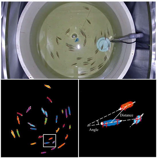 The Mask RCNN model, tailored for largemouth bass, was trained, utilizing a total of 1575 fish school images derived from nine aquaculture ponds, collected at 10-day intervals as the training dataset. Assessments of fish group swimming patterns were conducted by evaluating the angle and distance between the test fish and its nearest two companions [34,35]. During image data processing, a line connecting the head and tail of the focal fish was employed to represent its swimming direction. This line also facilitated the computation of the angle between the swimming direction of the focal fish and the swimming directions of its two closest neighbors. The line joining the line’s center and the centers of the two nearest neighbors were used to determine the shortest distance. By averaging 30 included angles and distances between 30 experimental fish and neighboring fish in each image, it was possible to determine the average angle and distance that represent the fish’s swimming capabilities. In each aquaculture tank, 120 photographs were randomly selected from a 5-min video daily at 03:00, 09:00, 15:00, 18:00, and 23:00. For the purpose of analyzing fish swimming behavior, 600 photos from each tank were chosen daily, amounting to a total of 194,400 photographs.