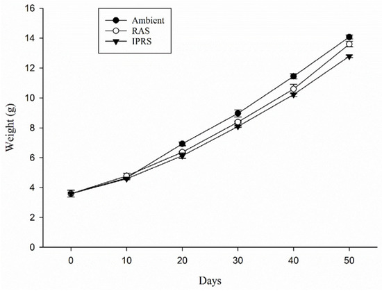 The results showed that at the end of the experiment, the Ambient group exhibited superior immune and antioxidant indicators (Table 2), with the serum glucose (Glu) in the Ambient group notably lower compared to the IPRS group. There were significant differences in malondialdehyde (MDA) activity among the three treatment groups (p < 0.05), with the lowest in the Ambient group at 0.92 ± 0.02 mg/mL. In terms of catalase (CAT), immunoglobulin M (IgM), lysozyme (LZM), and peroxidase (POX) activity, the Ambient group outperformed the RAS and IPRS groups, but the differences were not significant. Regarding digestive performance, the RAS group had higher CE activity, and the Ambient group had higher AMS activity, but neither showed significant differences (p > 0.05). The IPRS group had higher LPS activity, but its PEP activity was notably lower than that of the Ambient and RAS groups, at 3.67 ± 0.12 U/mgprot (Table 2). No significant differences in metabolic performance were observed among the three groups.