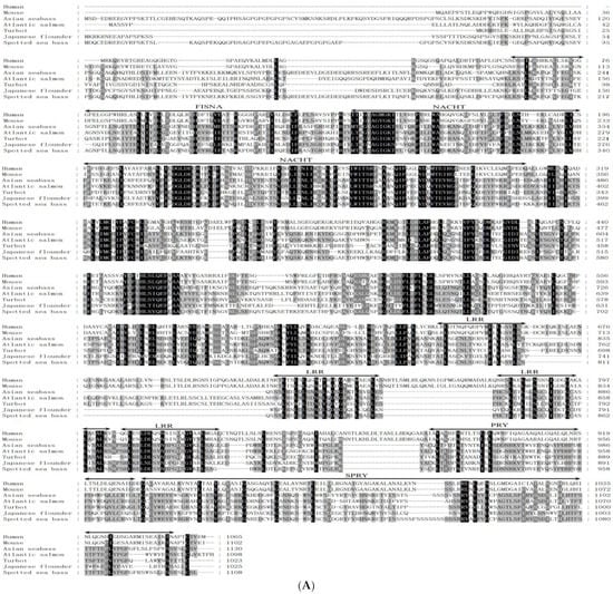 - Hou, Z.M.; Ye, Z.; Zhang, D.D.; Gao, C.B.; Su, B.F.; Song, L.; Tan, F.H.; Song, H.H.; Wang, Y.; Li, C. Characterization and expression profiling of NOD-like receptor C3 (NLRC3) in mucosal tissues of turbot (Scophthalmus maximus L.) following bacterial challenge. Fish Shellfish Immunol. 2017, 66, 231–239. [Google Scholar] [CrossRef]
