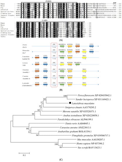 - Sun, Y.N.; Wang, J.; La, H.H.; Yin, Z.X.; He, W.; Weng, S.P.; Yu, X.Q.; Chan, S.M.; He, J.G. Molecular cloning and expression analysis of the ASC gene from mandarin fish and its regulation of NF-κB activation. Dev. Comp. Immunol. 2008, 32, 391–399. [Google Scholar] [CrossRef] [PubMed]