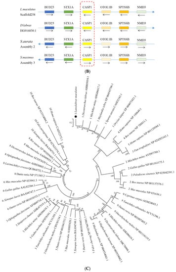 3.1. Sequence Features of NLRC3L, ASC, and Caspase1 of Spotted Sea Bass