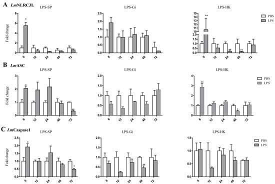 3.3. Expressions of NLRC3L, ASC, and Caspase1 of Spotted Sea Bass Following LPS Stimulation