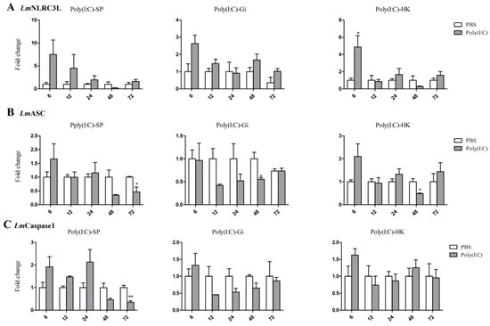 3.4. Expressions of NLRC3L, ASC, and Caspase1 of Spotted Sea Bass Following Poly (I:C) Stimulation
