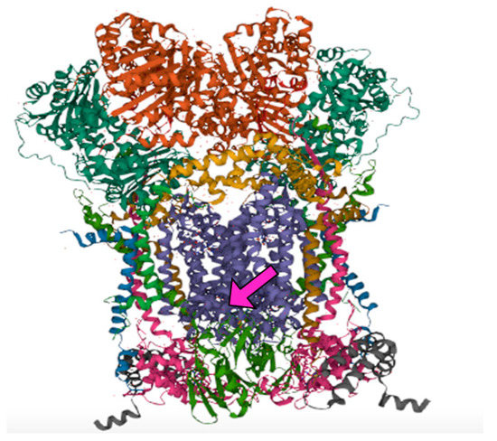 Secondary protein structure of antimycin A1 in complex with cytochrome bc1 as created with Visual Molecular Dynamics molecular modeling and visualization software v. 1.9.3 (Urbana, IL). The Antimycin-A interaction (arrow) is at the ligands in the lower portion of the bc1 complex.