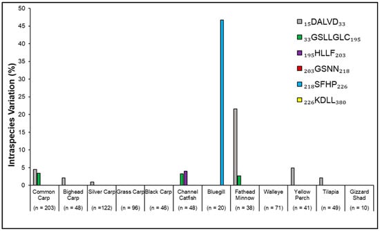 Within non-carp species, variations per motif in relation to the CCM (Formula (4); Figure 7; Table 2) illustrated that Walleye and Gizzard Shad showed complete similarity with CCM. The other five species showed considerable variation, with Channel Catfish showing the most and with variability in the first 3 of the 6 motifs being dissimilar from CCM at 98% of the individual identifiers (Figure 7). See Table A1 for the locations of the amino acids in non-carp species that differed from CCM. See Supplemental Table S2 for a summary of specifics per species.
