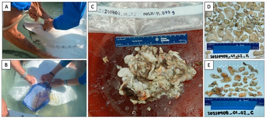 Once positioned, a fine-mesh produce bag (Ecowaare, approximately 0.5 × 0.5 mm) was secured around the pelvic fins and cinched tight with the drawstring, anterior to the cloaca, and the ray was tilted so the posterior portion of the body was lower than the anterior. The gastric lavage tube was then fed into the mouth, down the esophagus past the pectoral girdle, and into the stomach where ambient seawater flushed the ray’s digestive tract for up to two minutes or until clear seawater was flowing from the cloaca following the collection of the contents (Figure 2). Once the gastric lavage procedure was complete, the mesh bag was transferred to a cooler and stored on ice. At the lab, mesh bags containing the gut contents were transferred to a pre-weighed 405 × 405 mm mesh piece (BetterVue 1 × 1 mm, 48″ × 25′ roll, Phifer, Tuscaloosa, AL, USA) for long-term storage in a −20 °C chest freezer until processing. During processing, gut contents were thawed at room temperature, sorted into like species, photographed, then enumerated and weighed (0.001 g). Subsamples of like species, hereafter referred to as gastric lavage samples, were cut into 2 × 2 mm pieces, placed into 2 mL cryovials with 70% ethanol and stored in the −20 °C freezer until DNA extraction.
