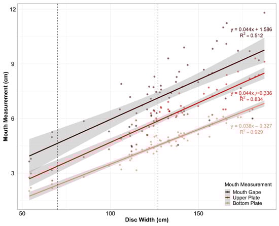 Mouth measurements for all whitespotted eagle rays captured over the duration of the study. The dotted lines refer to breaks in animal life stage denoting young of year (YOY, <70 cm), juveniles (70–127 cm) and mature individuals (>127 cm). A linear regression was fit to each mouth measurement.