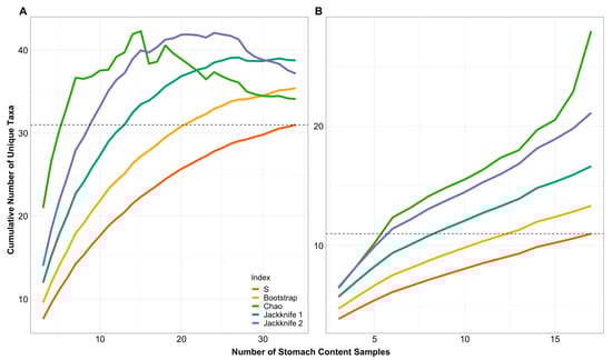 Cumulative prey curves using the cumulative number of prey items observed within the gut contents using modeled data from (A) the Atlantic Coast and (B) Gulf coast samples. The dotted line represents the total number of unique prey items observed within the gut contents. Colored symbology refers to the extrapolated species richness via specified model fits derived from the poolaccum function in the vegan package.