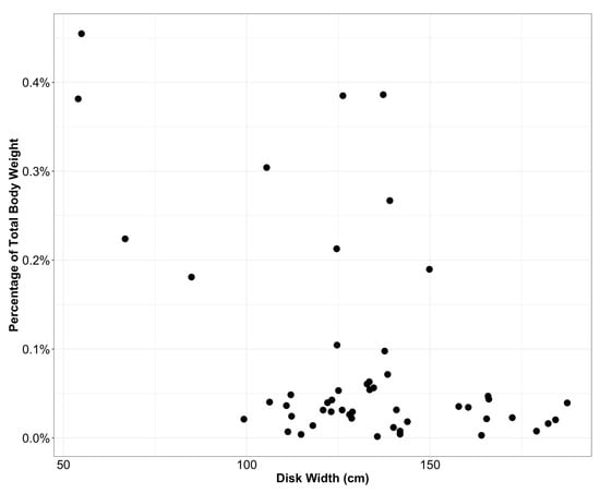Percentage of total body weight (using the total gut content weight divided by the weight of each whitespotted eagle ray) with respect to whitespotted eagle ray disc width in cm.