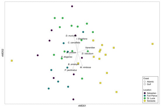 Using the dietary data from all individuals, the PERMANOVA revealed a significant site effect (Pseudo-F = 3.007; p = 0.001), but not a significant effect for life stage (Pseudo-F = 1.281; p = 0.099) or the combined effects of life stage and location (Pseudo-F = 1.116; p = 0.196). There was a high degree of overlap in the diet on the Atlantic coast (Figure 7). However, pairwise comparisons of location indicated that the diets of animals collected from St. Lucie were significantly different from that of both Fort Pierce (Pseudo-F = 2.040; p = 0.036) and Sebastian (Pseudo-F = 2.463; p = 0.006), but Fort Pierce and Sebastian were not significantly different from one another (Pseudo-F = 1.279; p = 0.163). SIMPER analyses suggested one species, giant false donax (I. brasiliana), drove the most dissimilarity when comparing significant pairwise combinations of Atlantic locations. Contributions of this species to the diet were greater in St. Lucie than both Fort Pierce (p = 0.020) and Sebastian (p = 0.031; Table 5) locations. When comparing ray diets between St. Lucie and Fort Pierce, only one other species accounted for an average dissimilarity of >10%, which was the thick lucine (P. pectinatus), whereby the average abundance was significantly greater in Fort Pierce than St. Lucie (p = 0.031). The yellow prickly cockle (D. muricata; p = 0.035) was significantly more abundant in St. Lucie than Fort Pierce, though the average abundance was <10%. All other species that were significantly dissimilar between Sebastian and St. Lucie were significantly more abundant in Sebastian, including cross-barred venus (C. cancellata, p = 0.017), lightning pitar (P. fulminatus, p = 0.035), ponderous ark (Noetia ponderosa; p = 0.008) and blood ark clam (A. ovalis; p = 0.003).