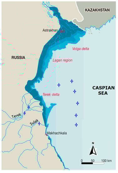 Fish samples were collected in the lower reaches of the Terek and Sulak rivers in addition to The Tersko-Caspian coast (Figure 1).