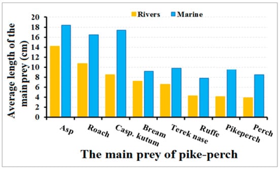 In the marine sample, among the prey, asp, kutum, roach, and pike-perch were distinguished in length, averaging 14.5–15.8 cm (Figure 2); in the rivers, asp and roach excelled, and the rest of the prey were smaller and varied between 3.9 and 9.8 cm, which corresponds to their natural parameters in the area [].