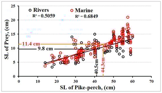 The average size of a pike-perch’s prey in rivers is 24.2% (from 9.3 to 38.5%) of its body length. At sea, the size of the prey is 25.7% (from 7.5 to 48.8%). As can be seen from Figure 3, the size of the prey increases slightly with the size of the predator (R2 = 0.50 in the river and 0.68 in the sea). Still, the large-sized pike-perch continues to feed on young fish with a body length of 3–16 cm (Table 3 and Figure 3).