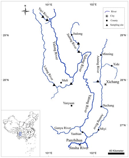 The Yalong River is a typical canyon river, whose basin is located in the south of the Qinghai-Tibet Plateau with 36,000 km2 of drainage area. It originates in the southern Bayan Har Mountains and spans a length of 1571 km []. It constitutes the largest tributary of the lower Jinsha River and is known for its unique plateau environment, which makes it suitable for E. davidi inhabitance. This area has a subtropical climate with an annual temperature of 7.3 °C and an annual average rainfall of 900 to 1400 mm []. Because of a sharp decrease in the elevation (from 4500 m to 900 m) and huge hydropower resources, the Yalong River Basin has emerged as an important hydropower development base in China []. However, hydropower development and excessive human interference have resulted in reduced fish resources in the middle and lower Yalong River, characterized by low age and miniaturization, reduced fish abundance and diversity, and even an increased possibility of extinction [].