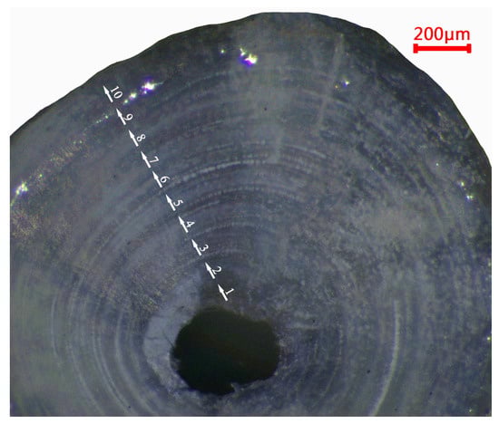 Each lapillus was fixed on a slide with nail polish, ground manually with wet sandpaper (2000–2500#), and polished with alumina paste (3 µm) until the core and all annuli were visible under a compound microscope (Olympus CX23, Tokyo, Japan) [].